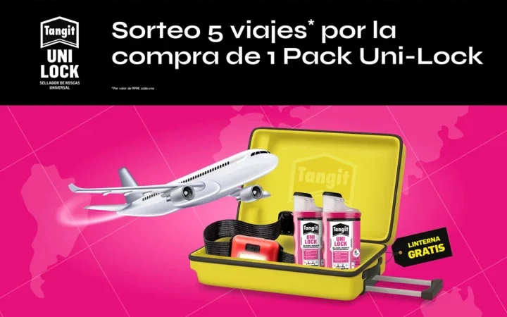 Tangit (Henkel) ha activado en España una promoción por compra en la que, adquiriendo 1 Pack Especial Tangit Uni-Lock, puedes optar a uno de 5 bonos viaje de 999€. Para participar, hay que registrarse online y subir la foto del ticket (según bases).