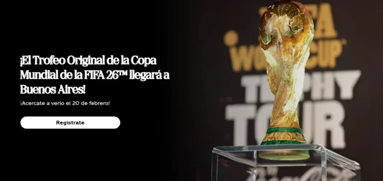 En Argentina, Coca-Cola activó la “Promo Tickets Trophy Tour Argentina 2026” para que puedas ganar 2 entradas digitales (QR) y ver el Trofeo de la Copa Mundial de la FIFA 26™ en el Trophy Tour del 20 de febrero de 2026 en La Rural (CABA).